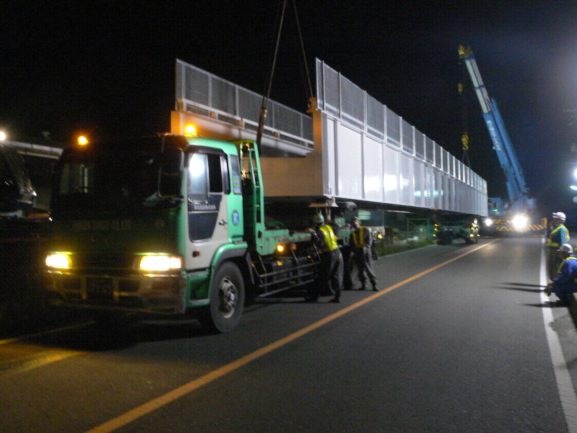 ポールトレーラーによって、43m橋桁を、トバシという積載法により、カーブでは後方車輪の舵を切りながら輸送した際の画像です。