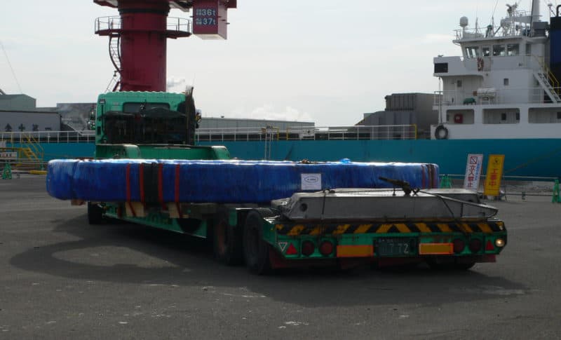 船からクレーンで卸した「風力発電部材【タワー部(直径4.7M/約81トン)】」を運搬【低床トレーラー…